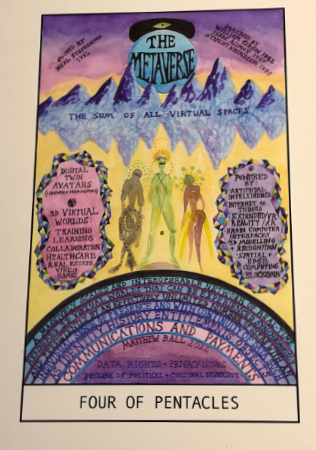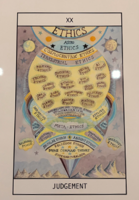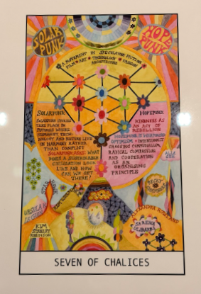 💬 Christine: I spent a lot of time on this work also, because I liked the alchemical, new agey visuals fascinating and have a soft interest in tarot cards. A lot of the cards also featured writers I admire (e.g., Ursula Le Guin, Liu Cixin, Donna Haraway, etc.) and complex concepts presented very systematically, almost like an infographic (e.g., Hopepunk and Solarpunk, Quantum Futures, AI, etc.).